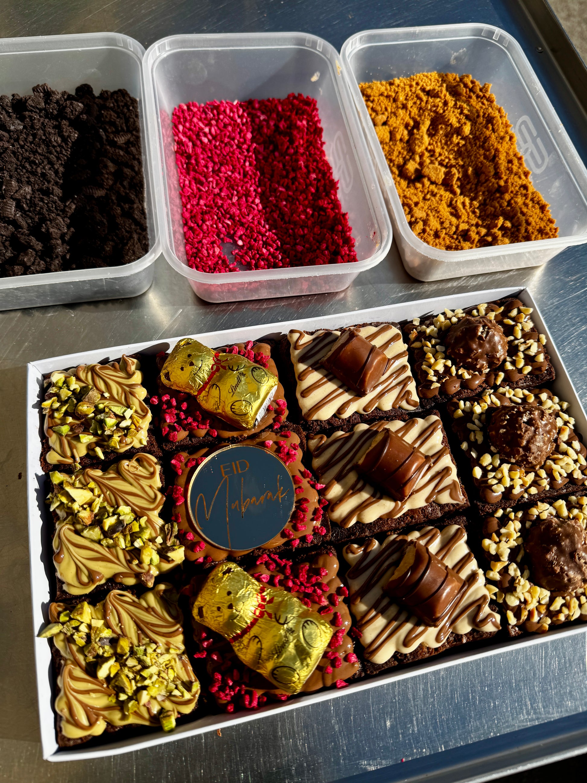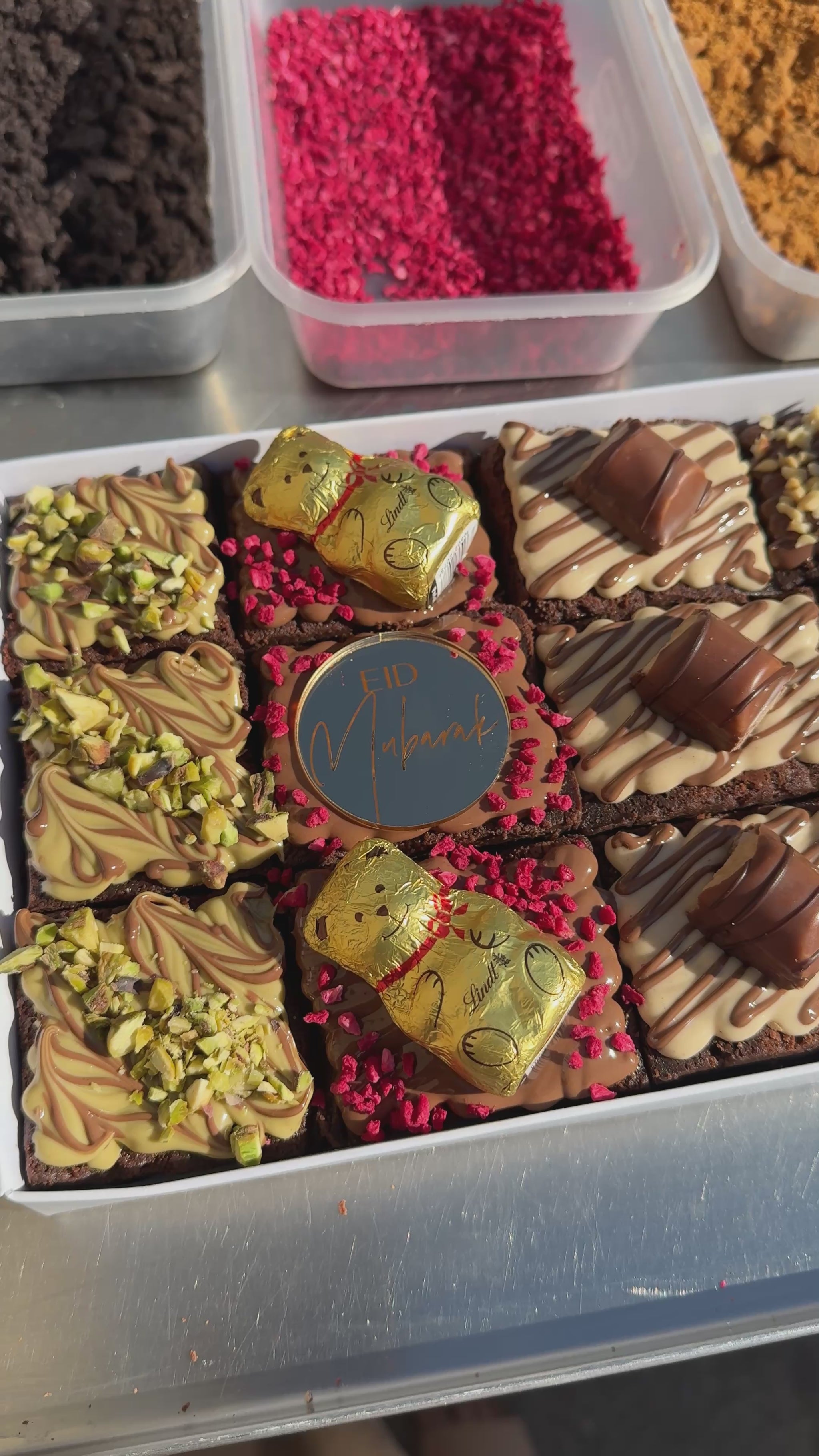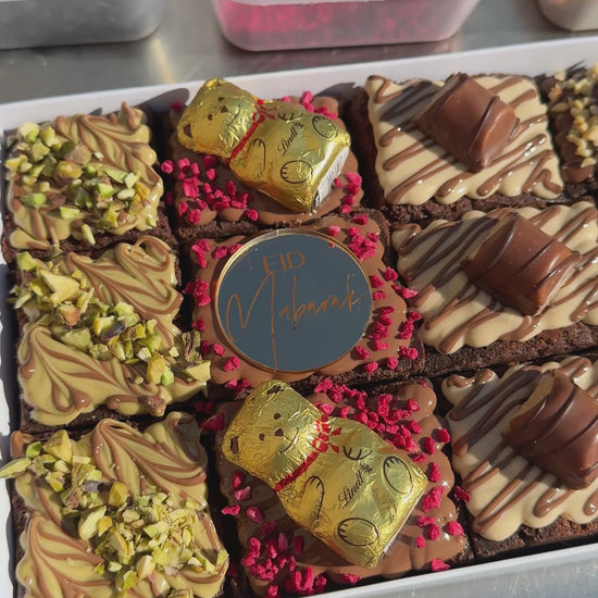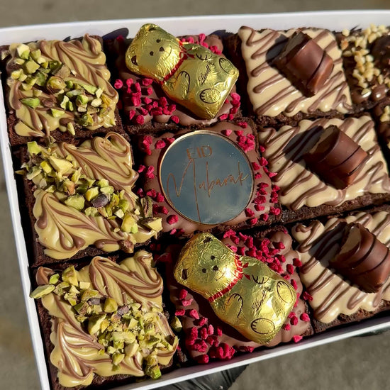 Calling all chocoholics — this one’s for you. Our 100 Hour Brownie: Chocolate Lovers Eid Edition is a celebration of all things rich, creamy, and irresistibly indulgent. Each ultra-fudgy brownie is slow-crafted over 100 hours for the perfect melt-in-your-mouth texture, then generously topped with a luxurious mix of roasted pistachios, milk chocolate Lindt teddies, smooth Kinder Bueno, golden Ferrero Rocher, Oreo cheesecake swirls, and a zesty Terry’s Chocolate Orange twist with popping candy for that extra surprise.